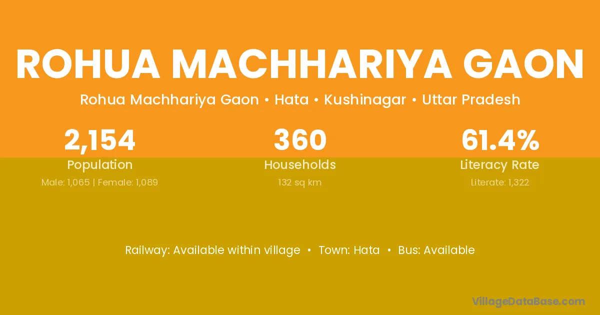 Rohua Machhariya Gaon village has a total population of 2,154 people, of which 1,065 are males and 1,089 are females.