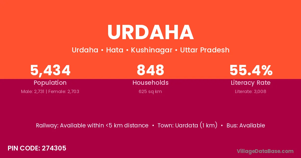Urdaha village has a total population of 5,434 people, of which 2,731 are males and 2,703 are females.