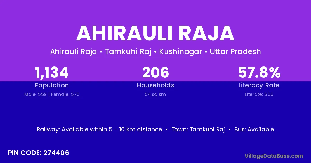 Kushinagar (26 km) is the nearest town to Ahirauli Raja village for major economic activities and is located approximately 26 km away.