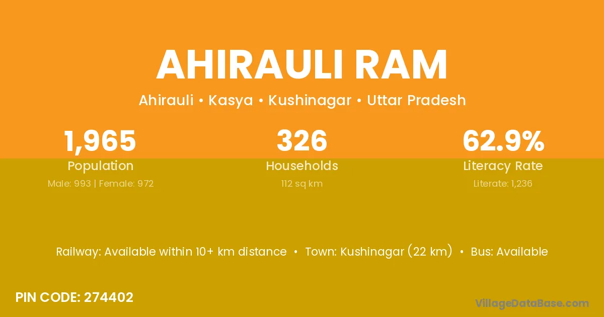 Kushinagar (22 km) is the nearest town to Ahirauli Ram village for major economic activities and is located approximately 22 km away.