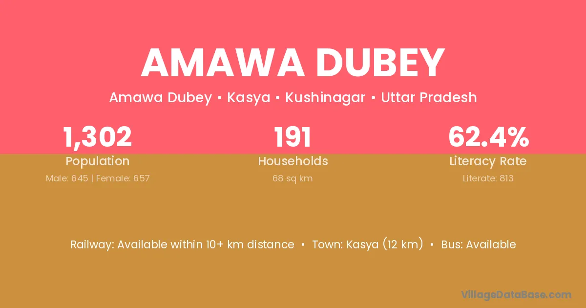 Kasya (12 km) is the nearest town to Amawa Dubey village for major economic activities and is located approximately 12 km away.