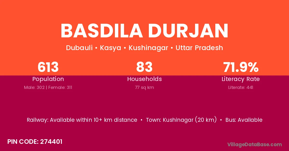 Kushinagar (20 km) is the nearest town to Basdila Durjan village for major economic activities and is located approximately 20 km away.