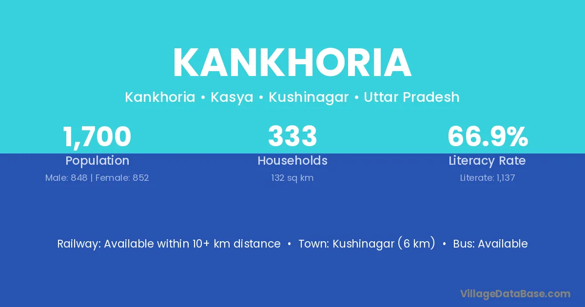 Kushinagar (6 km) is the nearest town to Kankhoria village for major economic activities and is located approximately 6 km away.
