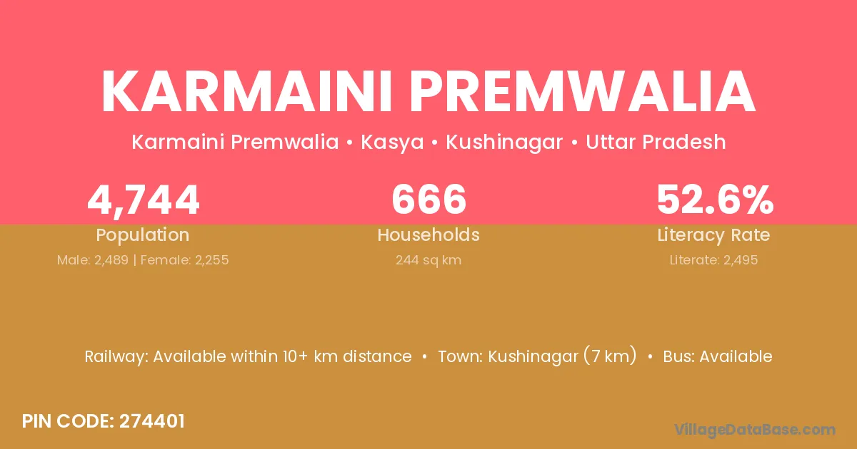 Kushinagar (7 km) is the nearest town to Karmaini Premwalia village for major economic activities and is located approximately 7 km away.