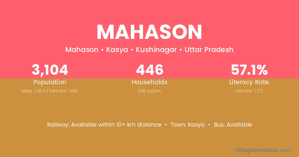 Mahason village has a total population of 3,104 people, of which 1,453 are males and 1,651 are females.