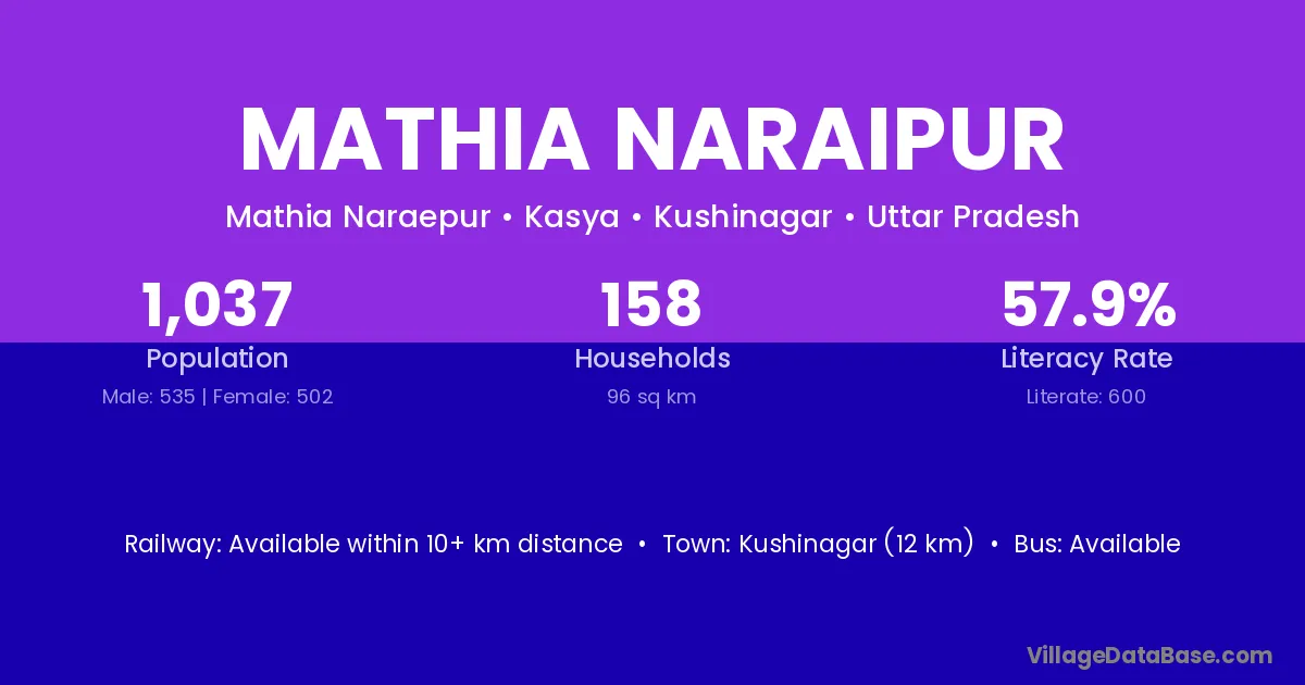 Kushinagar (12 km) is the nearest town to Mathia Naraipur village for major economic activities and is located approximately 12 km away.