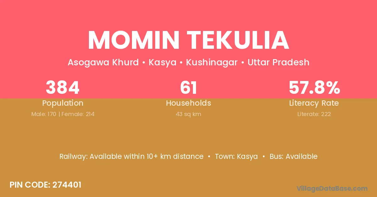 Momin Tekulia village has a total population of 384 people, of which 170 are males and 214 are females.