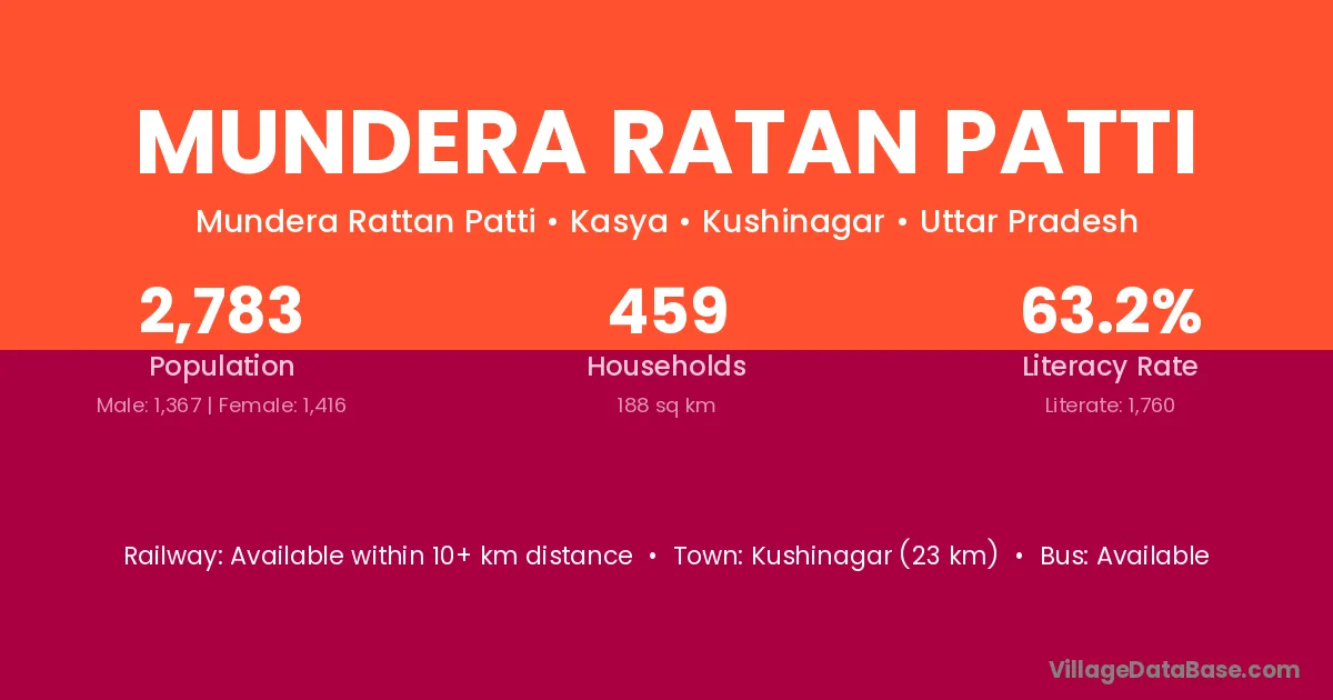 Kushinagar (23 km) is the nearest town to Mundera Ratan Patti village for major economic activities and is located approximately 23 km away.