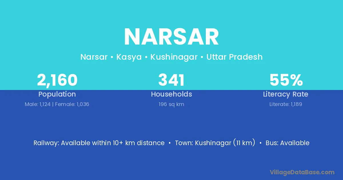 Kushinagar (11 km) is the nearest town to Narsar village for major economic activities and is located approximately 11 km away.