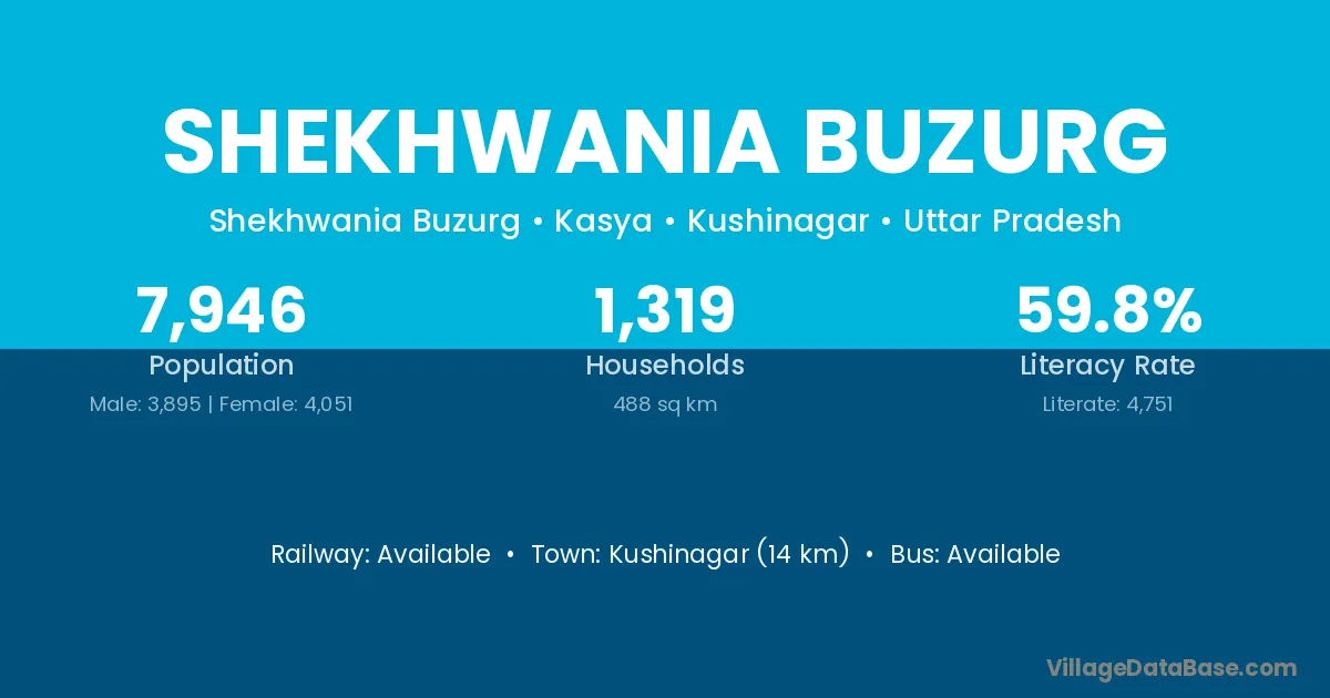 Kushinagar (14 km) is the nearest town to Shekhwania Buzurg village for major economic activities and is located approximately 14 km away.