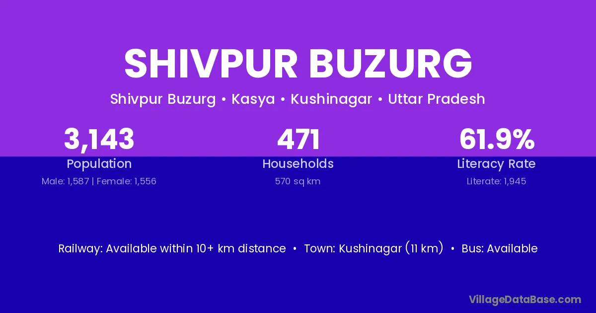 Kushinagar (11 km) is the nearest town to Shivpur Buzurg village for major economic activities and is located approximately 11 km away.