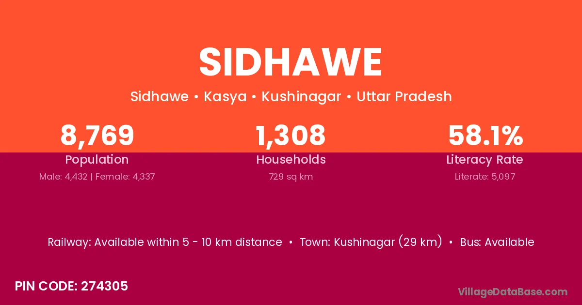 Kushinagar (29 km) is the nearest town to Sidhawe village for major economic activities and is located approximately 29 km away.