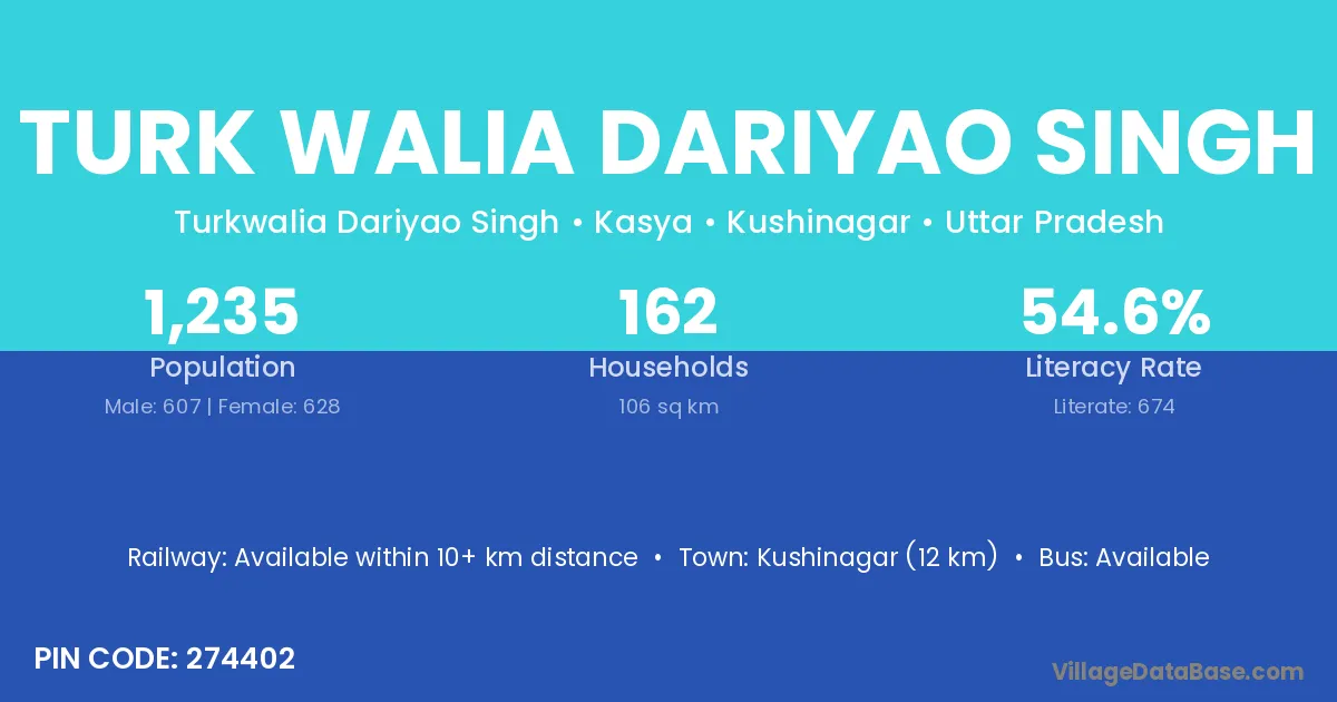 Kushinagar (12 km) is the nearest town to Turk Walia Dariyao Singh village for major economic activities and is located approximately 12 km away.
