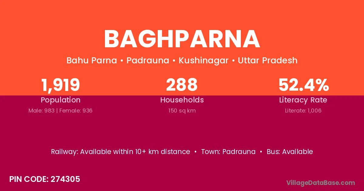 Baghparna village has a total population of 1,919 people, of which 983 are males and 936 are females.