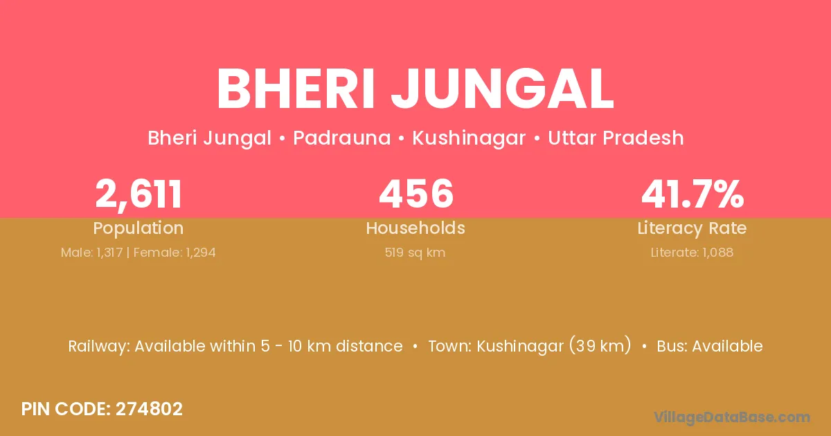 Kushinagar (39 km) is the nearest town to Bheri Jungal village for major economic activities and is located approximately 39 km away.