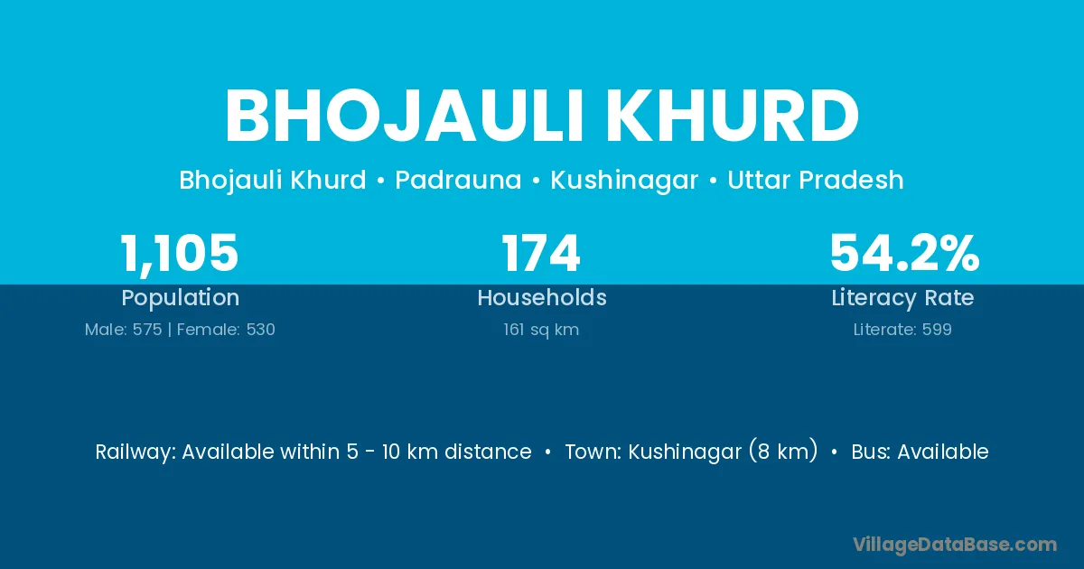 Kushinagar (8 km) is the nearest town to Bhojauli Khurd village for major economic activities and is located approximately 8 km away.
