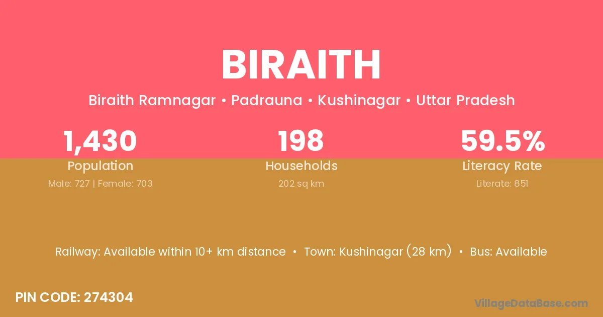 Kushinagar (28 km) is the nearest town to Biraith village for major economic activities and is located approximately 28 km away.