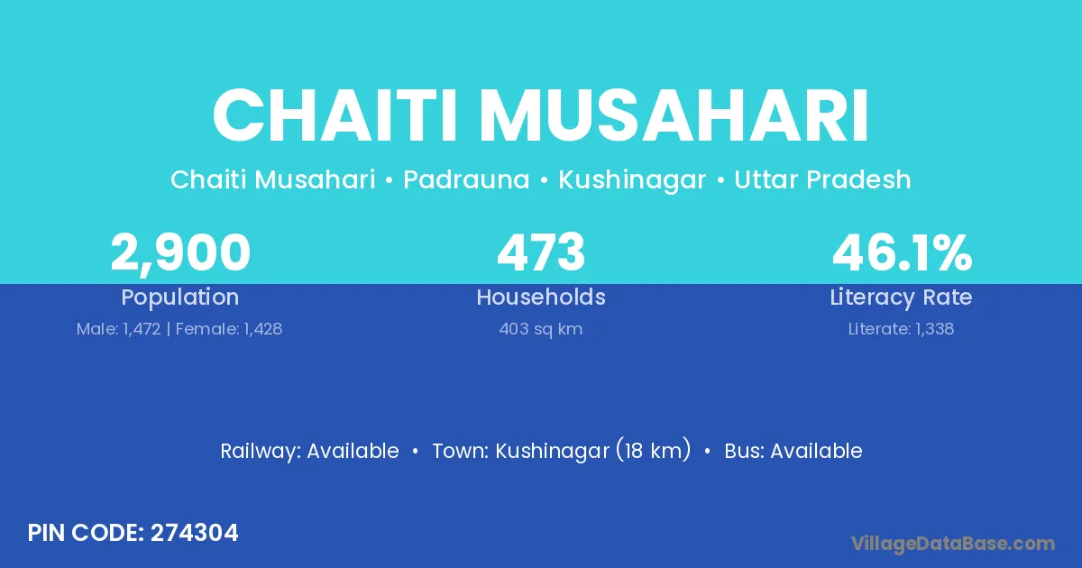 Kushinagar (18 km) is the nearest town to Chaiti Musahari village for major economic activities and is located approximately 18 km away.