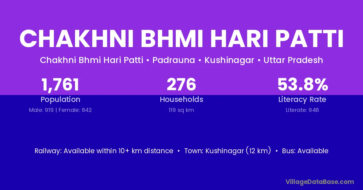Kushinagar (12 km) is the nearest town to Chakhni Bhmi Hari Patti village for major economic activities and is located approximately 12 km away.