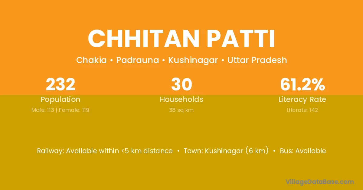 Kushinagar (6 km) is the nearest town to Chhitan Patti village for major economic activities and is located approximately 6 km away.