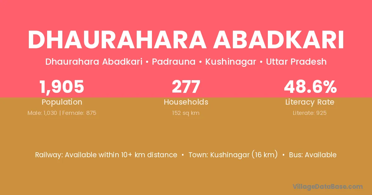 Kushinagar (16 km) is the nearest town to Dhaurahara Abadkari village for major economic activities and is located approximately 16 km away.