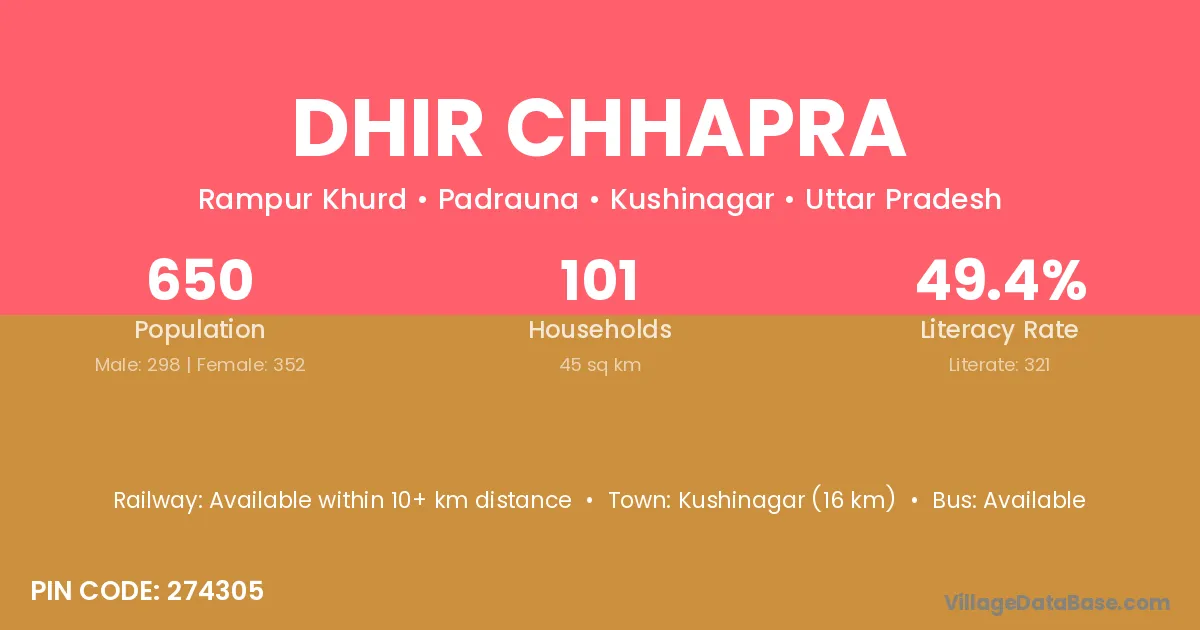 Kushinagar (16 km) is the nearest town to Dhir Chhapra village for major economic activities and is located approximately 16 km away.