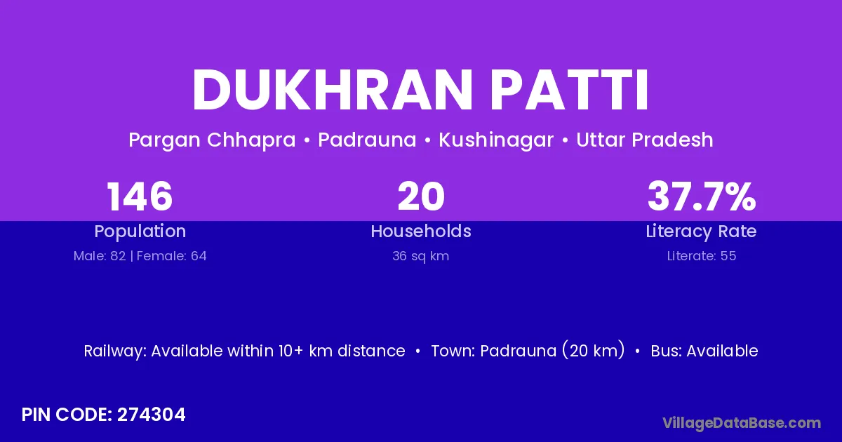 Padrauna (20 km) is the nearest town to Dukhran Patti village for major economic activities and is located approximately 20 km away.