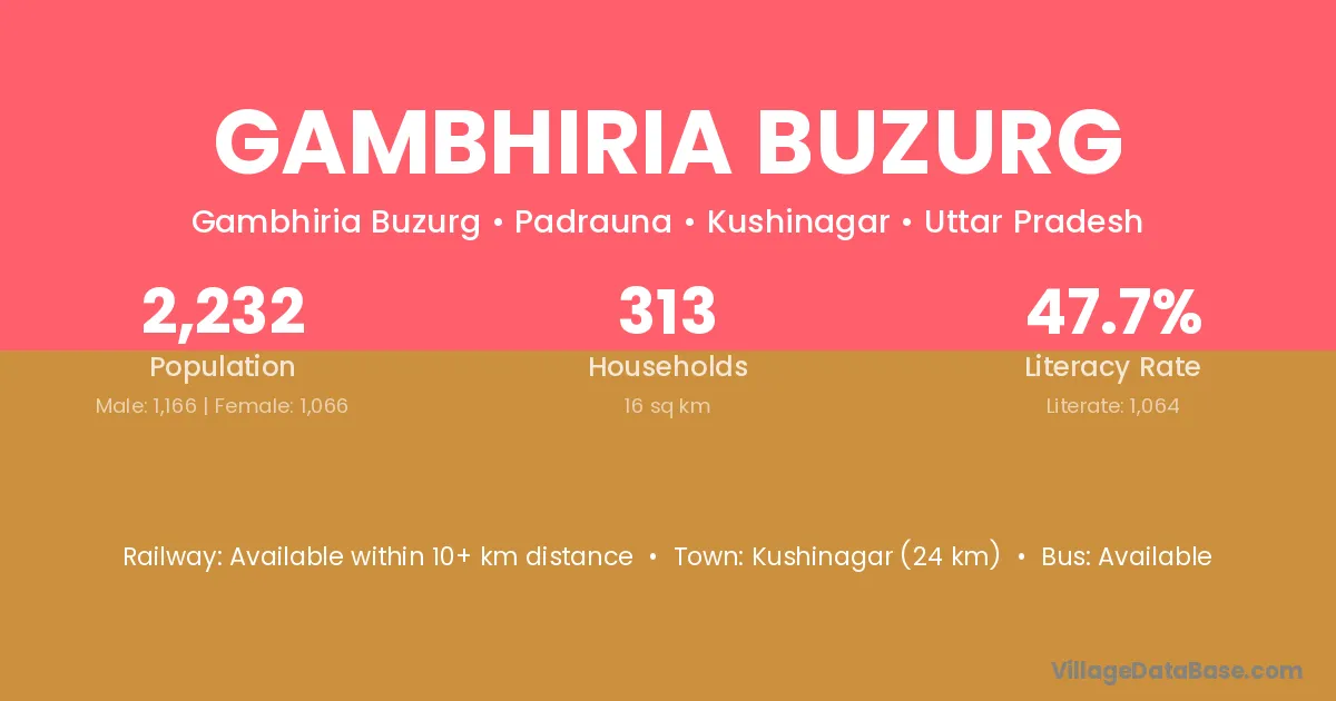 Kushinagar (24 km) is the nearest town to Gambhiria Buzurg village for major economic activities and is located approximately 24 km away.