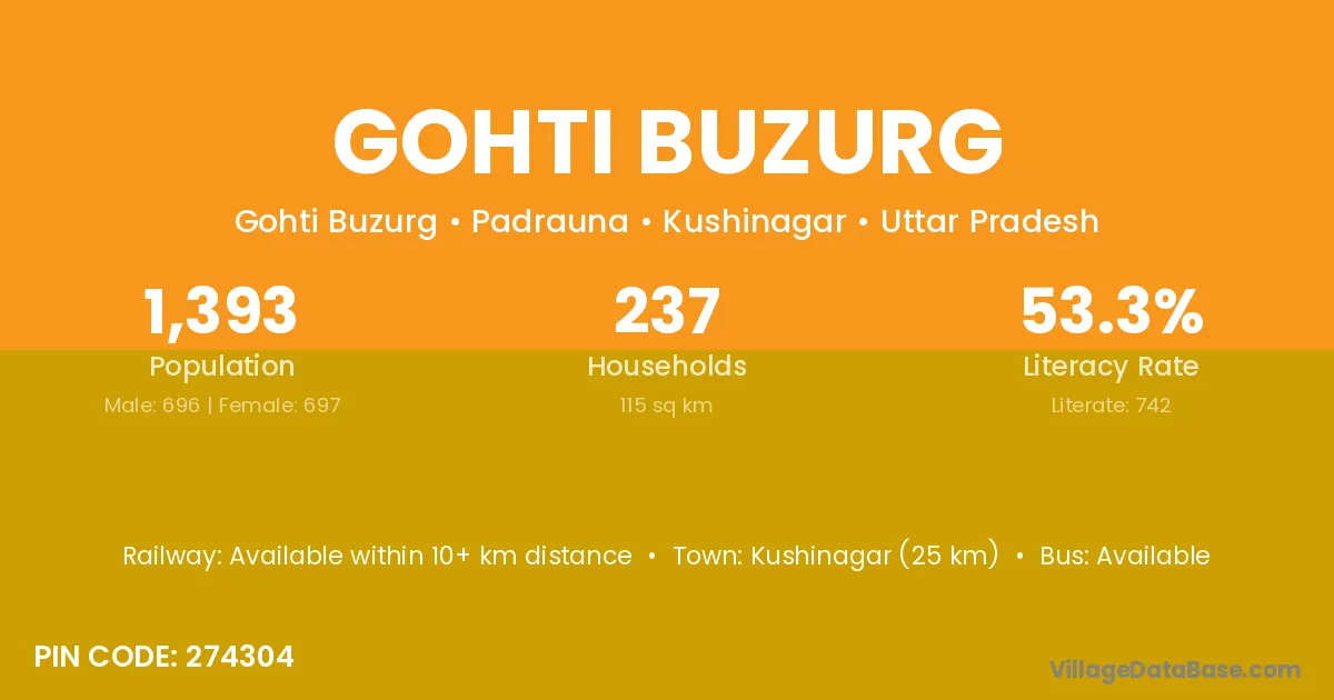 Kushinagar (25 km) is the nearest town to Gohti Buzurg village for major economic activities and is located approximately 25 km away.