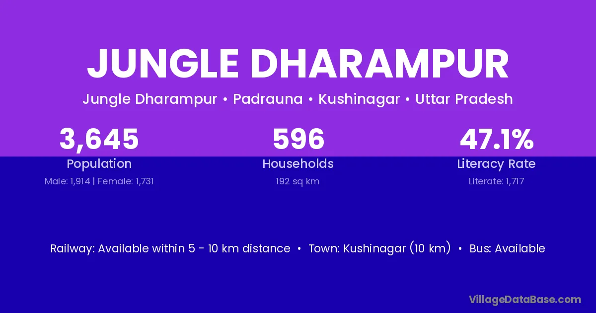 Kushinagar (10 km) is the nearest town to Jungle Dharampur village for major economic activities and is located approximately 10 km away.