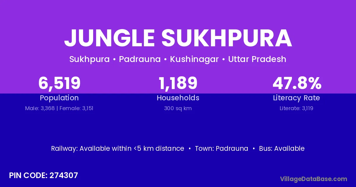 Jungle Sukhpura village has a total population of 6,519 people, of which 3,368 are males and 3,151 are females.