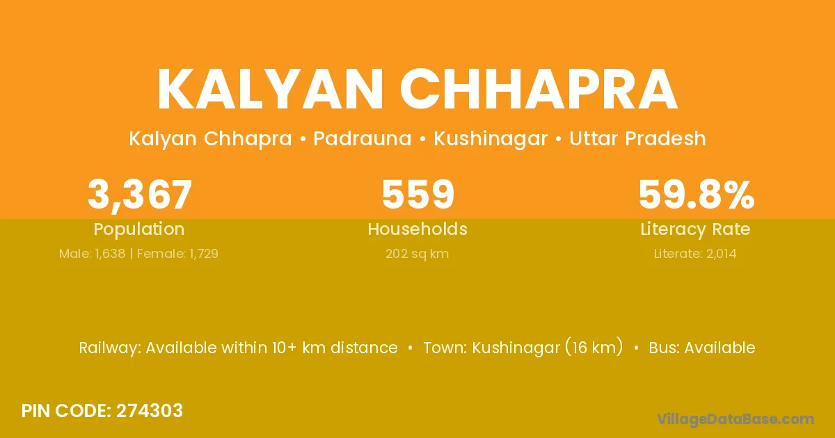 Kushinagar (16 km) is the nearest town to Kalyan Chhapra village for major economic activities and is located approximately 16 km away.