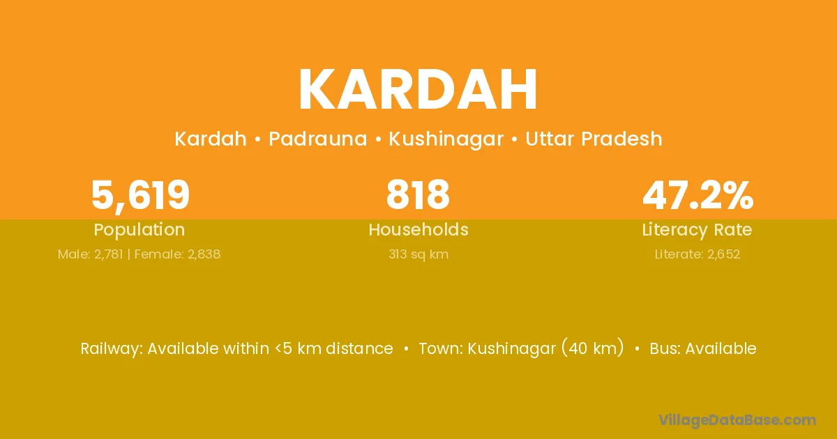 Kushinagar (40 km) is the nearest town to Kardah village for major economic activities and is located approximately 40 km away.