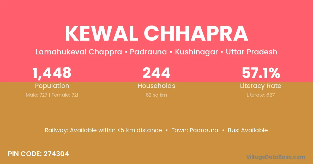 Kewal Chhapra village has a total population of 1,448 people, of which 727 are males and 721 are females.