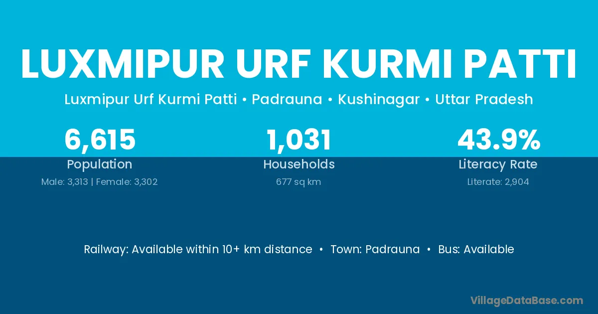 Luxmipur Urf Kurmi Patti village has a total population of 6,615 people, of which 3,313 are males and 3,302 are females.