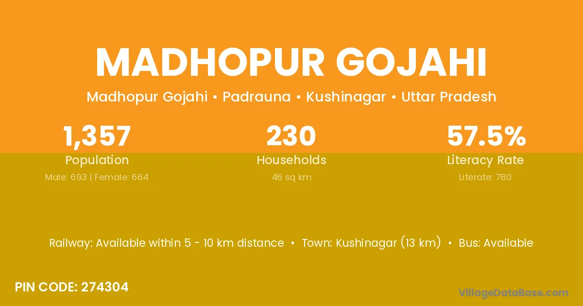 Kushinagar (13 km) is the nearest town to Madhopur Gojahi village for major economic activities and is located approximately 13 km away.