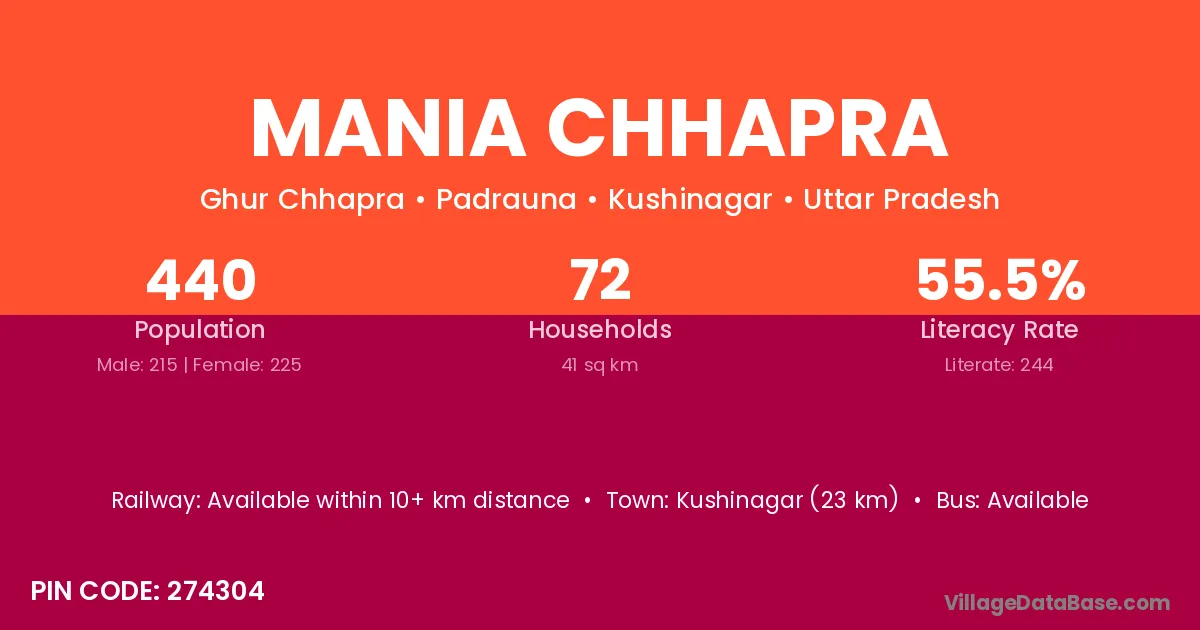 Kushinagar (23 km) is the nearest town to Mania Chhapra village for major economic activities and is located approximately 23 km away.