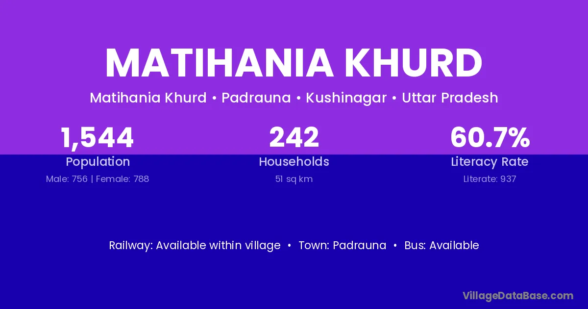 Matihania Khurd village has a total population of 1,544 people, of which 756 are males and 788 are females.