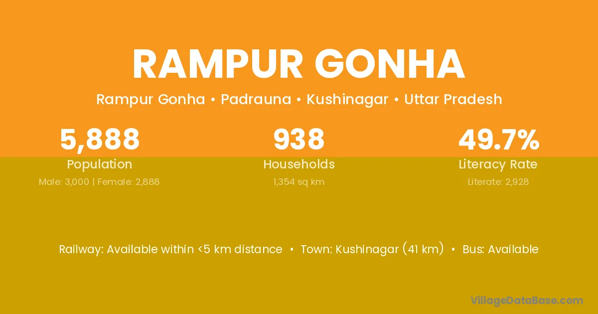 Kushinagar (41 km) is the nearest town to Rampur Gonha village for major economic activities and is located approximately 41 km away.