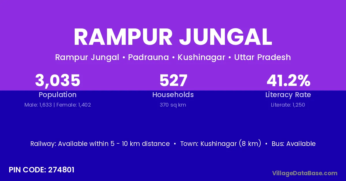Kushinagar (8 km) is the nearest town to Rampur Jungal village for major economic activities and is located approximately 8 km away.