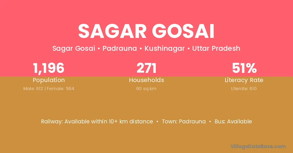Sagar Gosai village has a total population of 1,196 people, of which 612 are males and 584 are females.