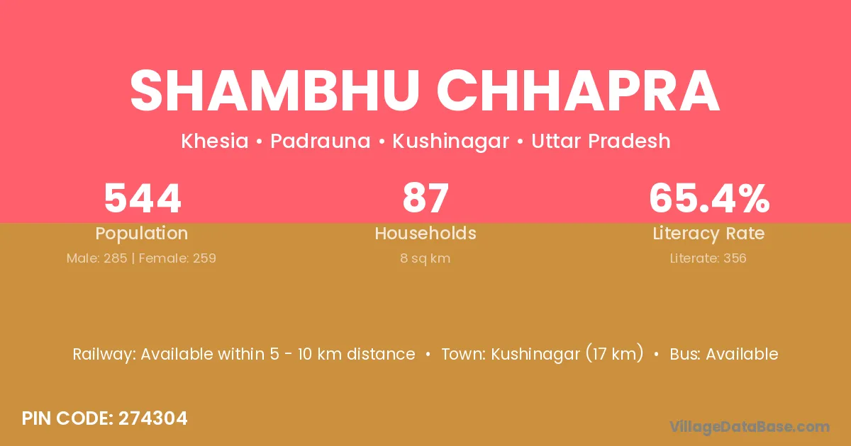 Kushinagar (17 km) is the nearest town to Shambhu Chhapra village for major economic activities and is located approximately 17 km away.