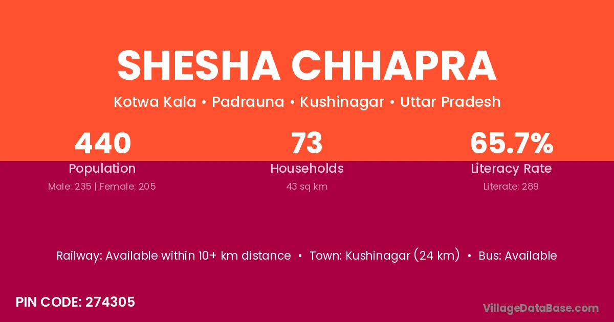Kushinagar (24 km) is the nearest town to Shesha Chhapra village for major economic activities and is located approximately 24 km away.