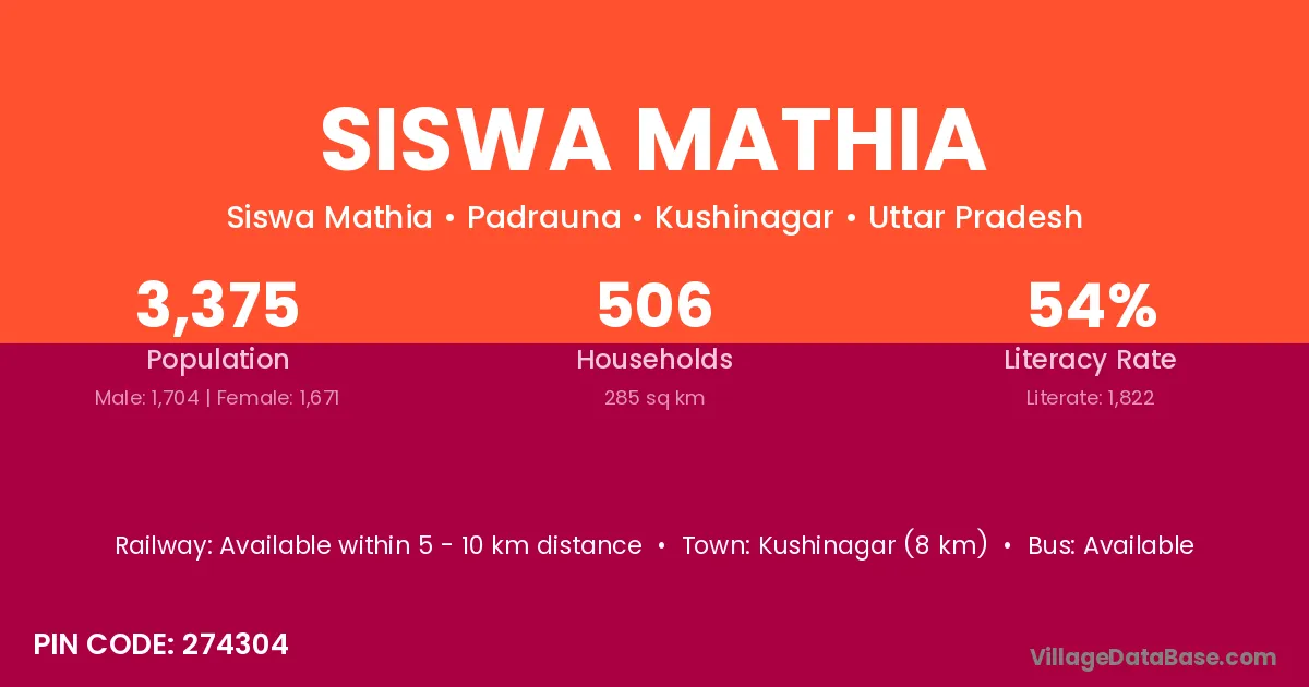 Kushinagar (8 km) is the nearest town to Siswa Mathia village for major economic activities and is located approximately 8 km away.
