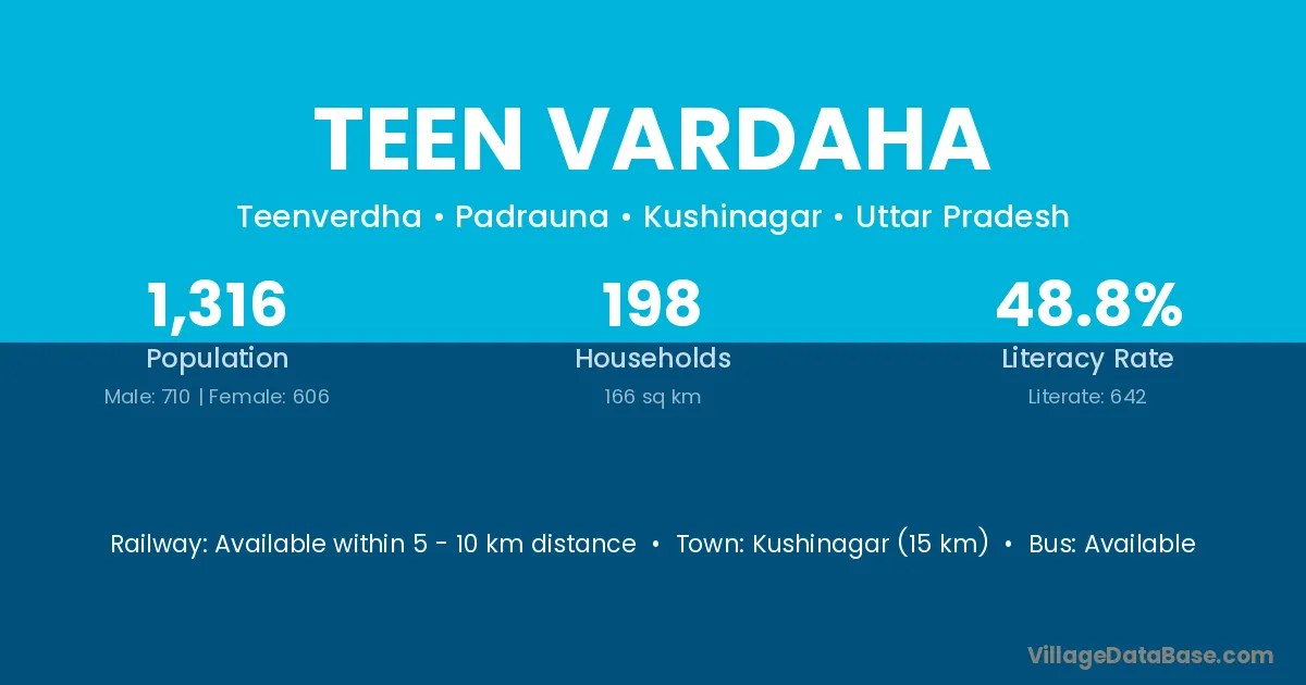 Kushinagar (15 km) is the nearest town to Teen Vardaha village for major economic activities and is located approximately 15 km away.