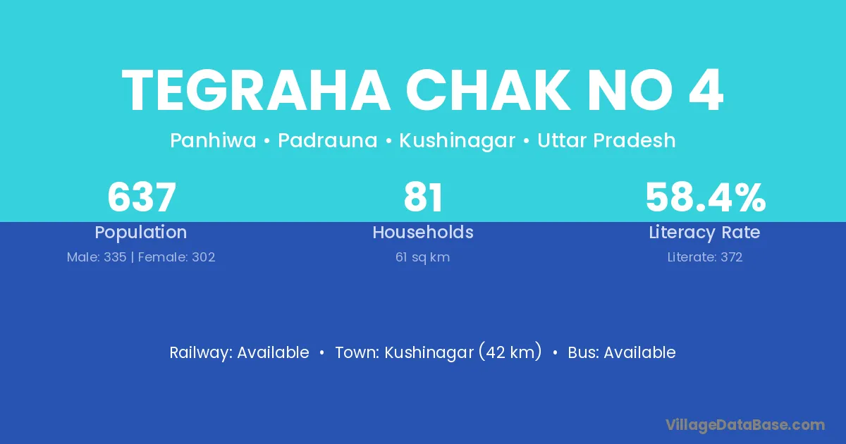Kushinagar (42 km) is the nearest town to Tegraha Chak No 4 village for major economic activities and is located approximately 42 km away.