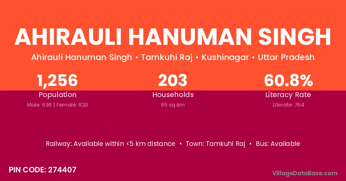 Ahirauli Hanuman Singh village has a total population of 1,256 people, of which 636 are males and 620 are females.