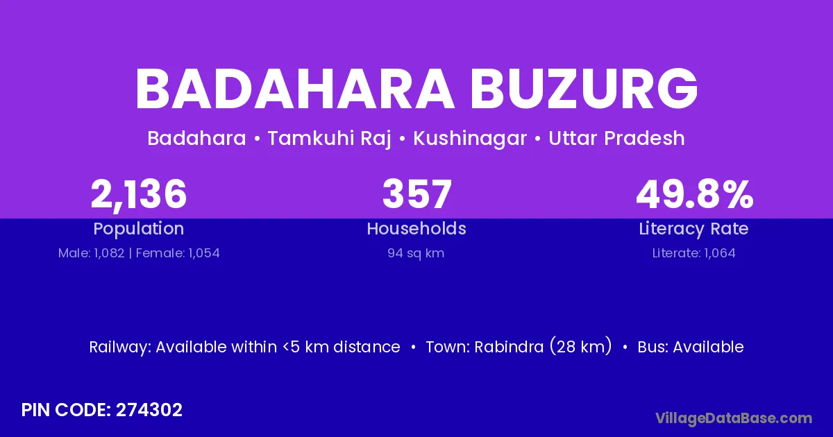 Badahara Buzurg village has a total population of 2,136 people, of which 1,082 are males and 1,054 are females.