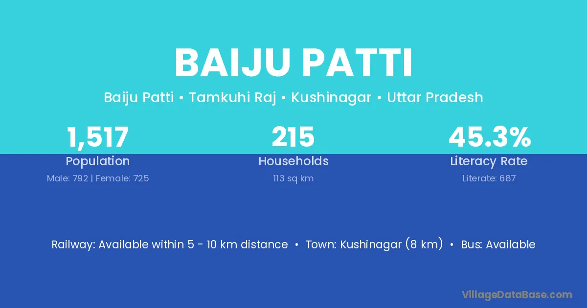 Kushinagar (8 km) is the nearest town to Baiju Patti village for major economic activities and is located approximately 8 km away.