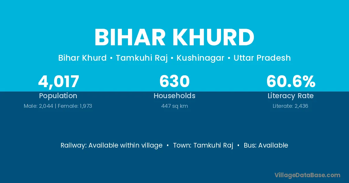 Bihar Khurd village has a total population of 4,017 people, of which 2,044 are males and 1,973 are females.